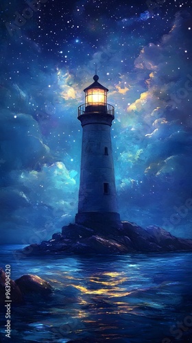 Illuminated Lighthouse on Rocky Coast Under Starry Sky
