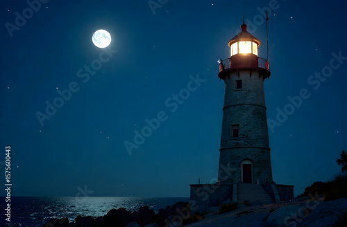 Illuminated lighthouse standing on rocky shore at night, realistic style, moonlit sky background, symbol of guidance and safety at sea