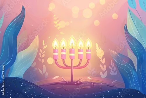 Illuminated menorah in mystical forest