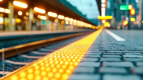 Illuminated modern train platform at night with glowing yellow edge tactile paving in sharp focus emphasizing depth perspective urban transportation