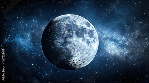 Illuminated Moon Surrounded By Starry Night Sky And Cosmic Clouds In Dark Space