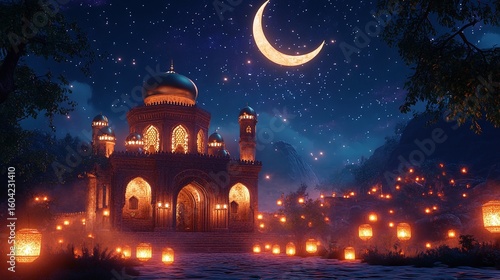 Illuminated mosque complex under a starry night sky.