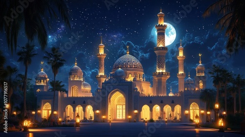 Illuminated Mosque Under a Starry Night Sky with a Full Moon