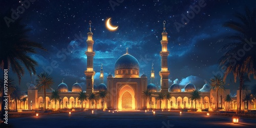 Illuminated Mosque with Crescent Moon and Stars at Night