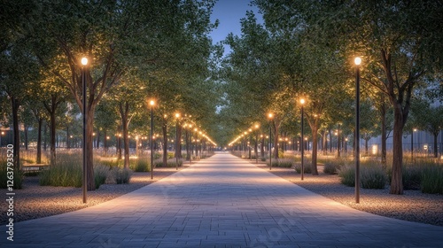 Illuminated park path at twilight, trees, lamp posts, city in background