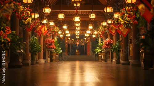 Illuminated pathway in a traditional Asian temple. Ornate lanterns hang above, flanked by vibrant red flowers and lush greenery. A sense of serenity and peace pervades the scene.