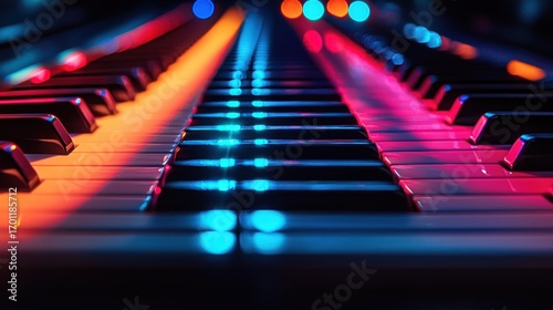 Illuminated piano keyboard close-up, vibrant colors, music.
