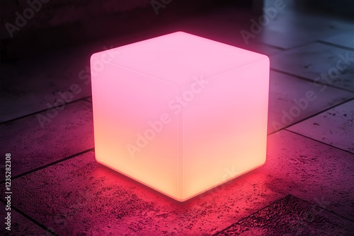 Illuminated Pink Cube on Textured Floor Modern Abstract Design Glowing Light