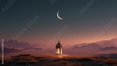 Illuminated Ramadan Lantern in Desert Landscape Under Crescent Moon and Starry Night