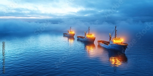 Illuminated ships sailing through fog, creating a serene twilight scene on calm waters.