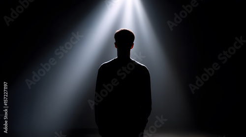 Illuminated Silhouette: A person stands under a brilliant beam of light, the contrast between the darkness and the light source creates an atmosphere of mystery, spirituality, and contemplation.