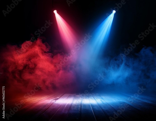 Illuminated stage with scenic lights and smoke. blue red spotlight with smoke