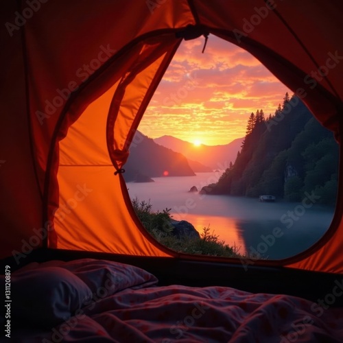 Illuminated tent interior, fiery sunset over foggy river , warmth, fantasy, magical