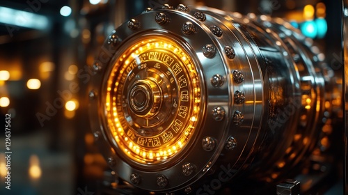 Illuminated vault door, intricate details.