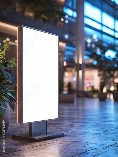 Illuminated vertical advertisement stand in modern dimly lit shopping mall at night on polished floor showcasing blank display space for marketing