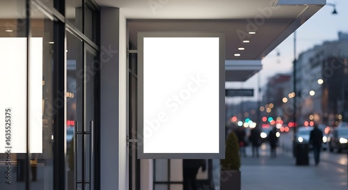 Illuminated white billboard sign on a building facade at night. Urban commercial advertising space template.