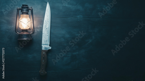 Illuminating Danger: A vintage lantern casts an eerie glow next to a large knife on a dark, textured surface, hinting at suspense, danger, and a sense of foreboding.