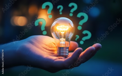 Illuminating Innovation A Glowing Lightbulb Held in a Hand with Question Marks, Symbolizing Ideas, Solutions, and the Power of Thought to Brighten Challenges