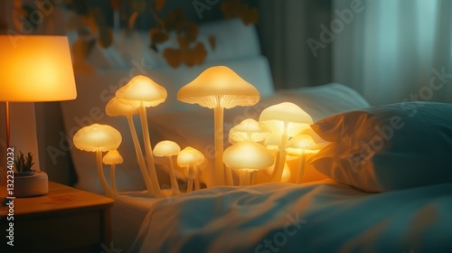Illuminating mushrooms on a bed at night