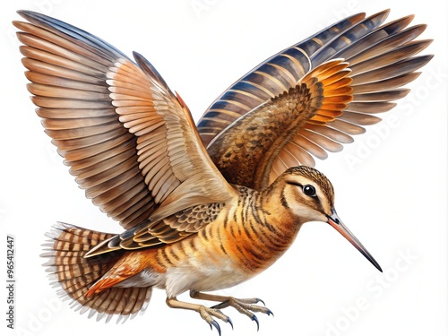 Illustrate a majestic woodcock bird in flight, with feathers ruffled, wings spread, and long, slender neck stretched forward