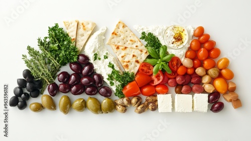 Illustrate a variety of Mediterranean foods shaped into an elongated triangle against a white background. Feature elements like hummus, pita bread, olives, grape leaves, and feta cheese arranged