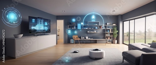 illustrate the concept of the Internet of Things with an image of a smart home, featuring various connected devices and appliances, shot from a low angle with a wide-angle lens