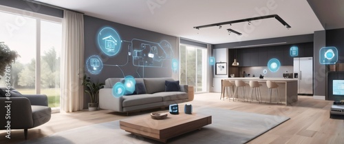illustrate the concept of the Internet of Things with an image of a smart home, featuring various connected devices and appliances, shot from a low angle with a wide-angle lens