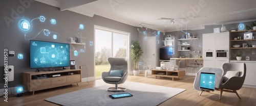 illustrate the concept of the Internet of Things with an image of a smart home, featuring various connected devices and appliances, shot from a low angle with a wide-angle lens