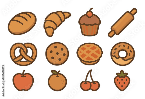 Illustrated assorted bakery and fruit icons on brown background