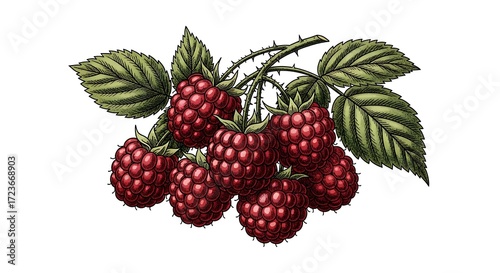 Illustrated botanical drawing of ripe raspberries with leaves on a white background