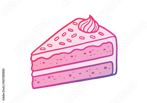 Illustrated cake slice with pink frosting, sprinkles, gradient effect backdrop