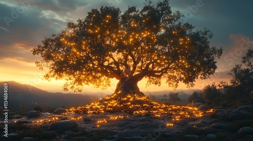 Illustrated Clovis sacred tree tied offerings of carved wooden amulets stones animal parts representing prayers and wishes the tree glowing with symbolic significance against a twilight sky