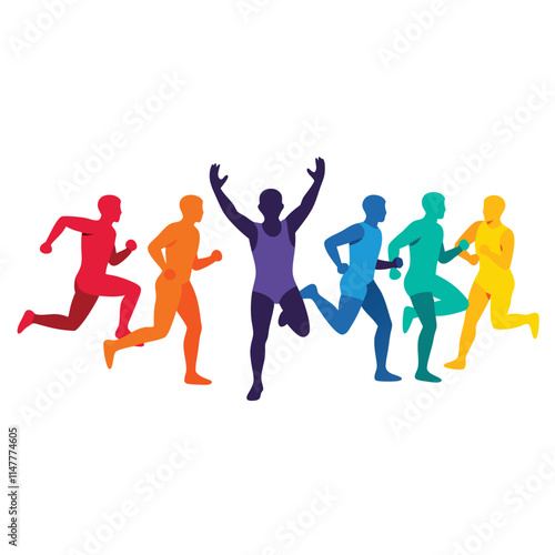 Illustrated depiction of a group of runners celebrating as they cross the finish line. Vibrant and uplifting representation of determination, athleticism, teamwork, and accomplishment in sports.