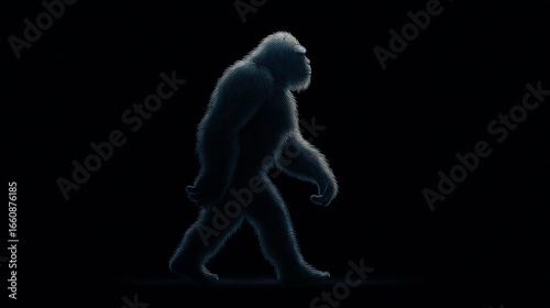 Illustrated hairy bipedal creature walks right against a dark backdrop with subtle lighting