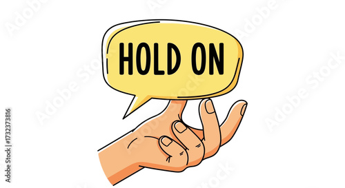 Illustrated hand holding a speech bubble with 'Hold On' message against white backdrop