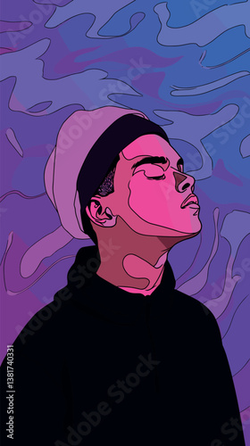Illustrated portrait of asian young male in pink and purple tones with beanie hat