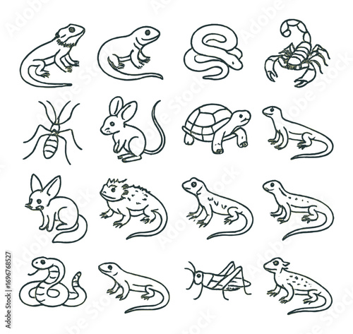 Illustrated reptiles and insects collection featuring lizards, snakes, and bugs