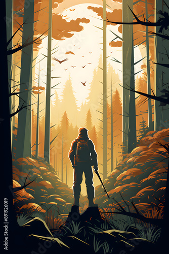 illustrated vintage style hunter in the woods, hunter in the woods illustration