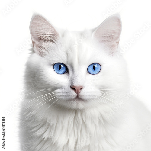 Illustration, AI generation. white cat with blue eyes, face shot , isolated on white background. Pet, dog.