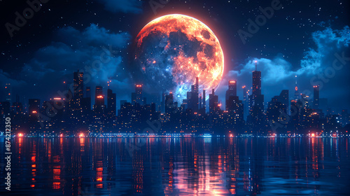 illustration art cities with full moon style art anime