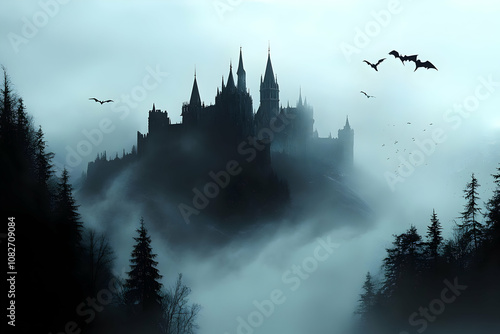 Illustration Dark Castle Fog Bats Fantasy Gothic Spooky Mystery