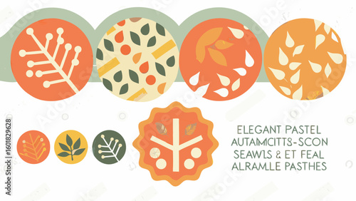 Illustration featuring botanical motifs in circles and a central floral emblem with soft pastel colors silhouette