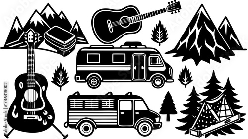 Illustration featuring camping elements including guitars, mountains, vans, tents, and trees in black and white on transparent background silhouette