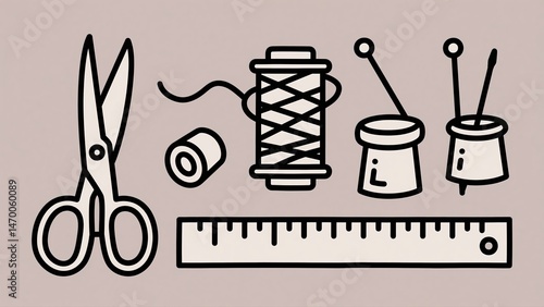 Illustration featuring sewing supplies: scissors, thread, needles, and a ruler in a clean, minimalist style on a soft beige background, perfect for craft and design projects 8K