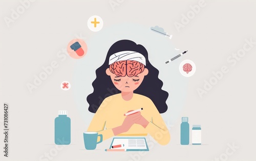 Illustration in flat style depicting a woman applying a bandage on a brain injury.