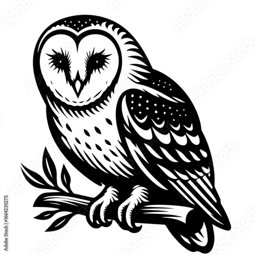 Illustration of a black and white owl perched on a branch with detailed feather patterns and sharp eyes