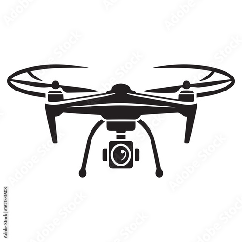 Illustration of a black drone with camera isolated on white background, showcasing its design and functionality for aerial photography, videography, and surveillance purposes