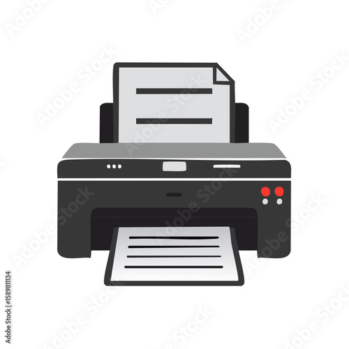 Illustration of a black printer with documents, showcasing office equipment and printing operations for business or personal use.