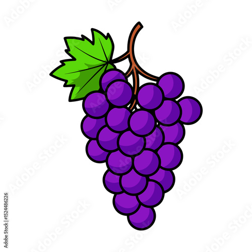 Illustration of a bunch of purple grapes with a green leaf on a white background image view