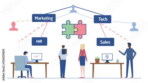 Illustration of a business organizational chart with employees and departments connected by lines and puzzles